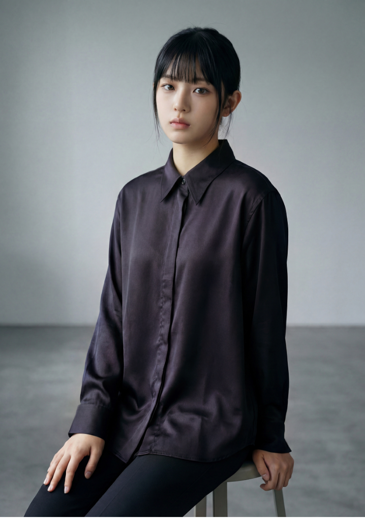 Oversized shirt in soft silk with an asymmetric, unisex cut. The back is longer than the front for a modern street-elegant style. Features a hidden English-style button placket with the top button visible. At the back, it showcases the logo label and yoke, highlighted by a central pleat.