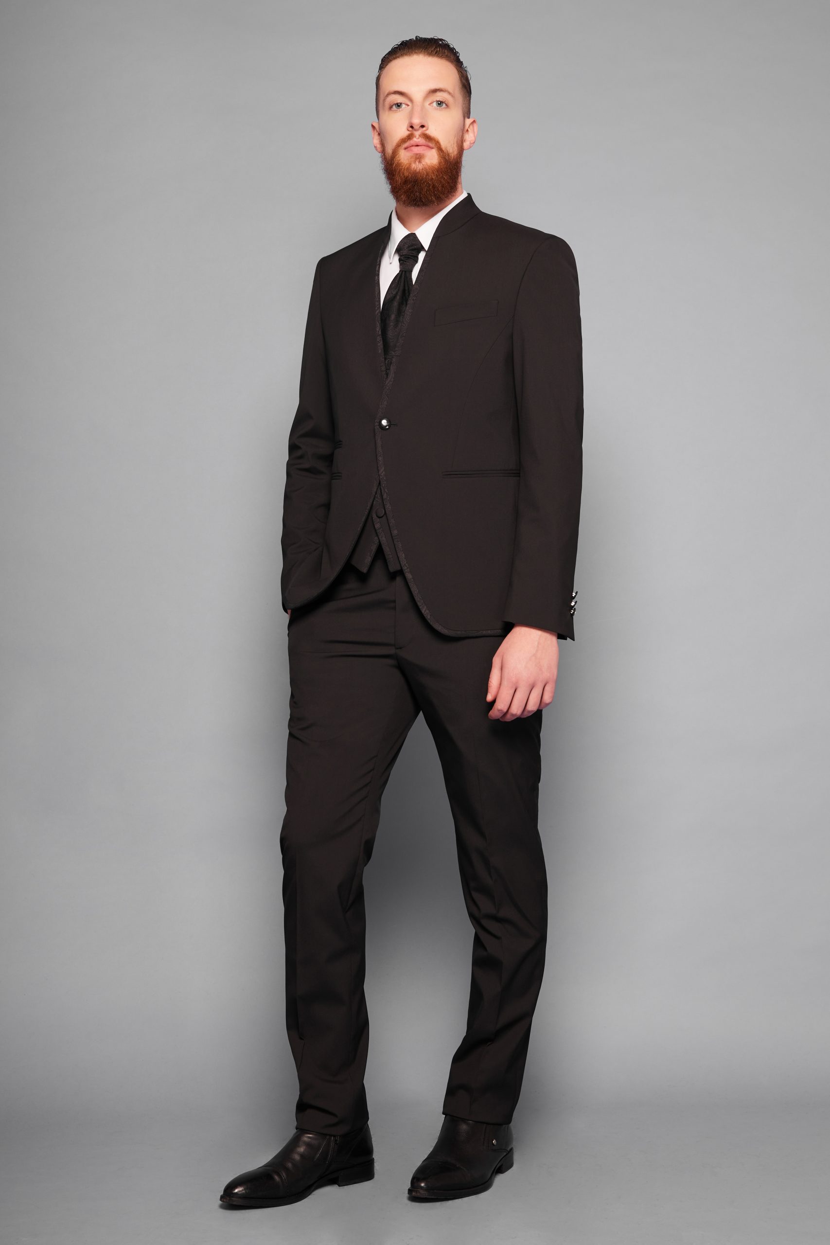 Cottone offers elegant and refined single-breasted suit with Korean collar and jewel button.