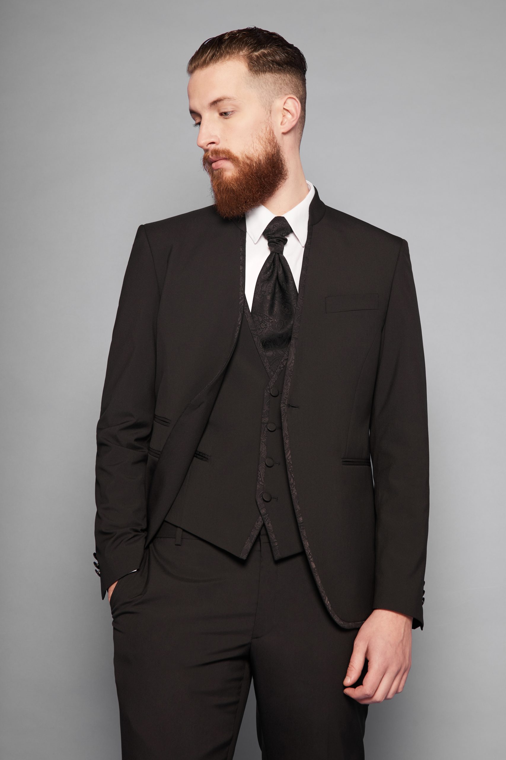 Suit complete with single-breasted waistcoat with damask fabric insert, a damask fabric tie and slim-fit trousers.