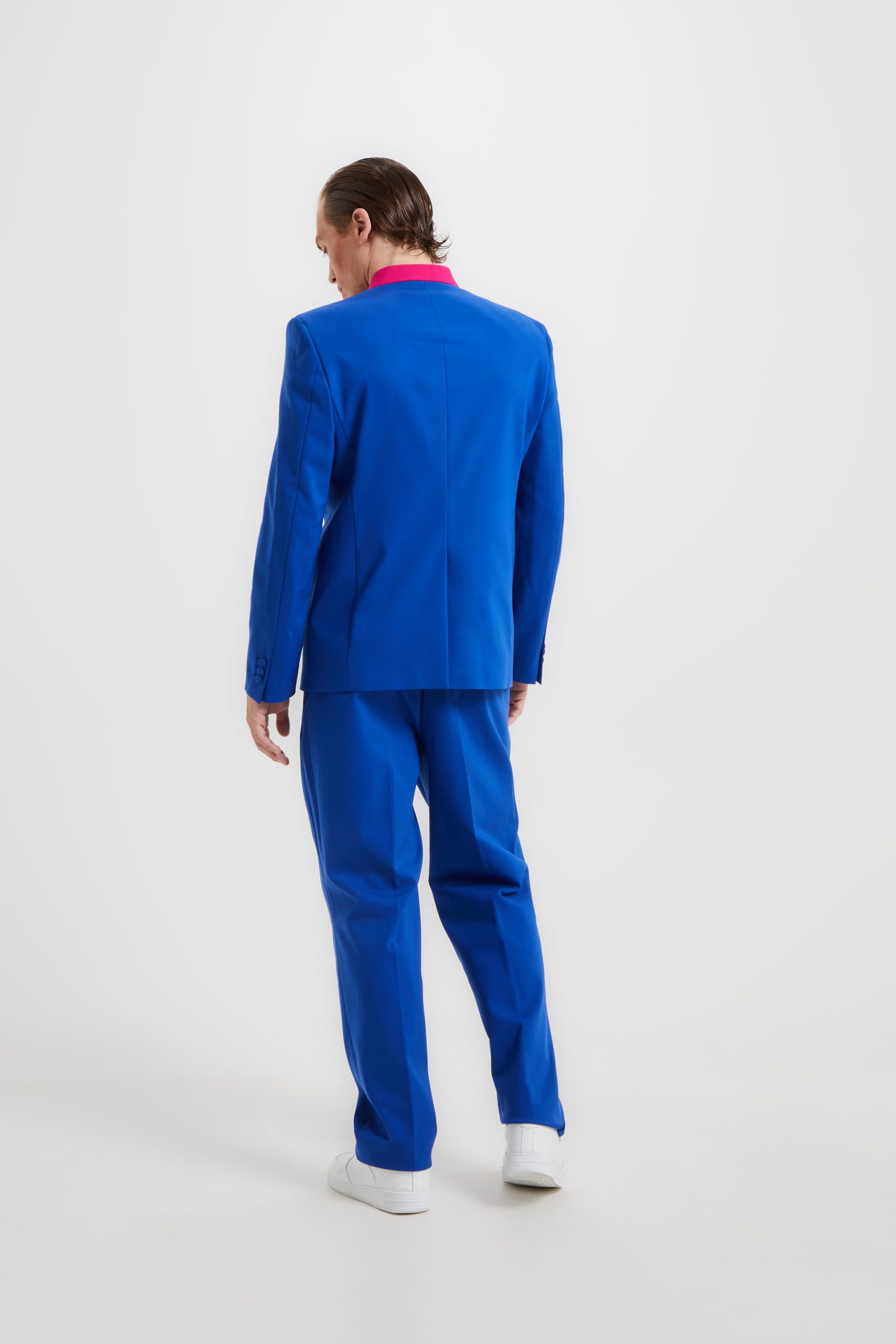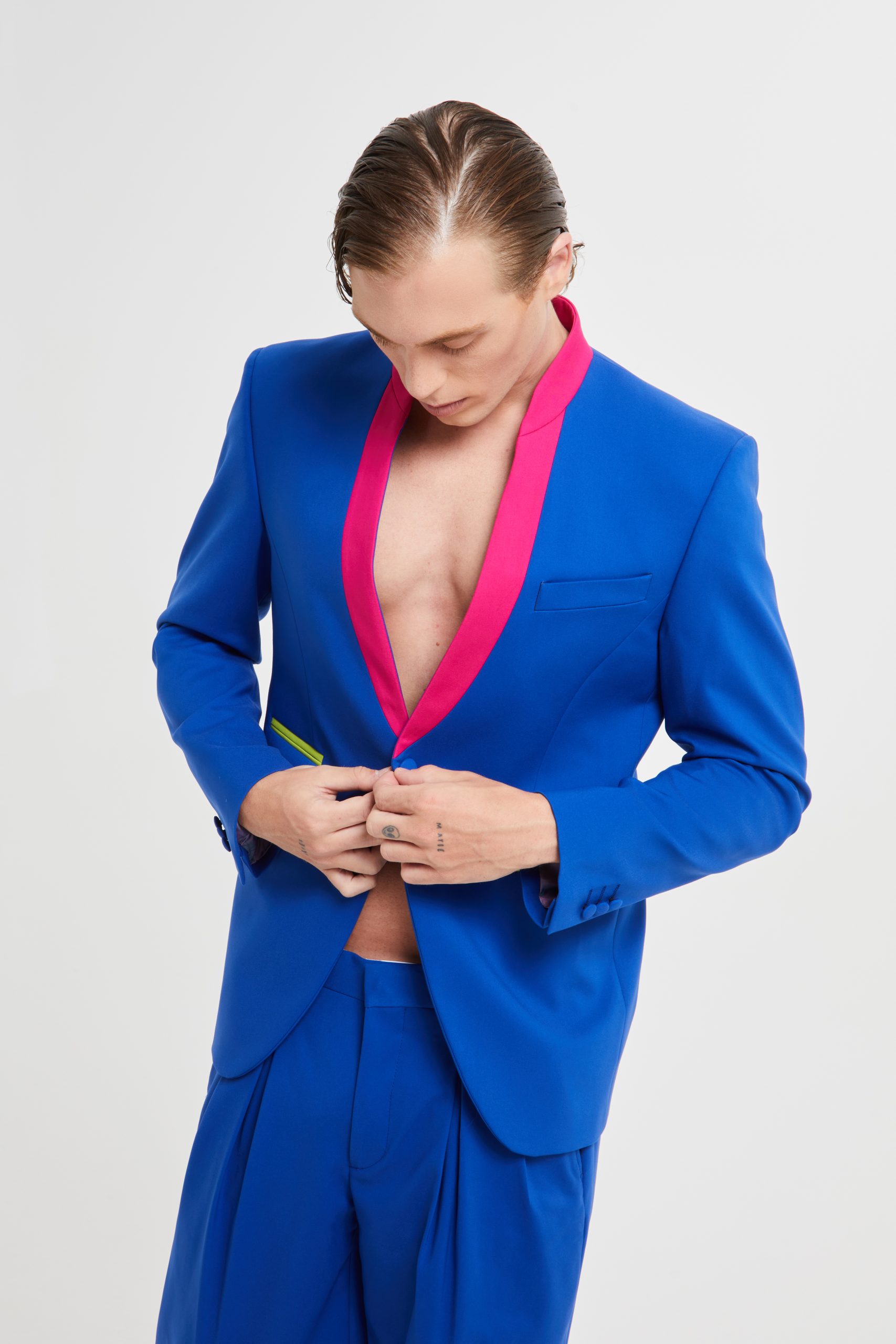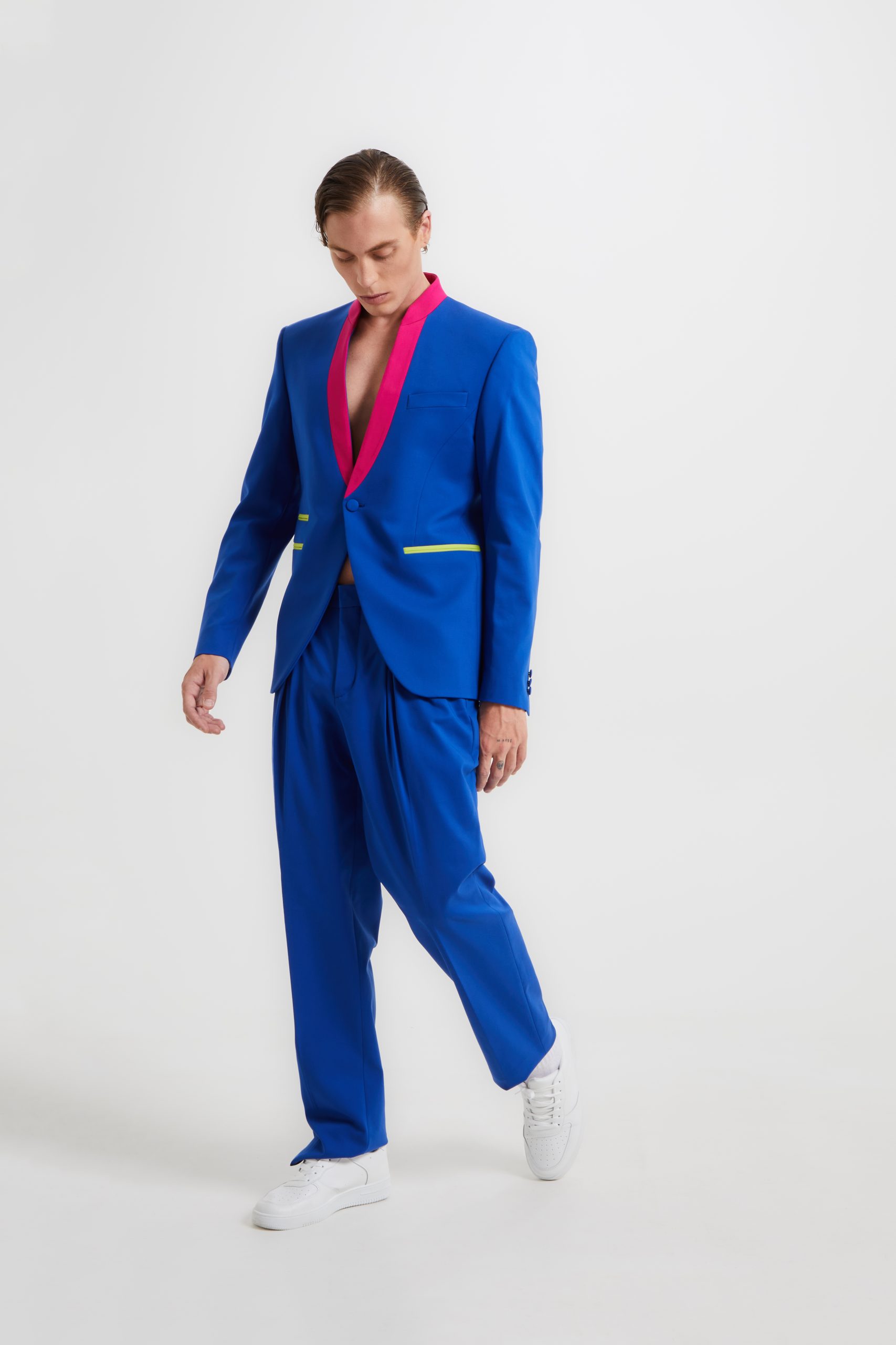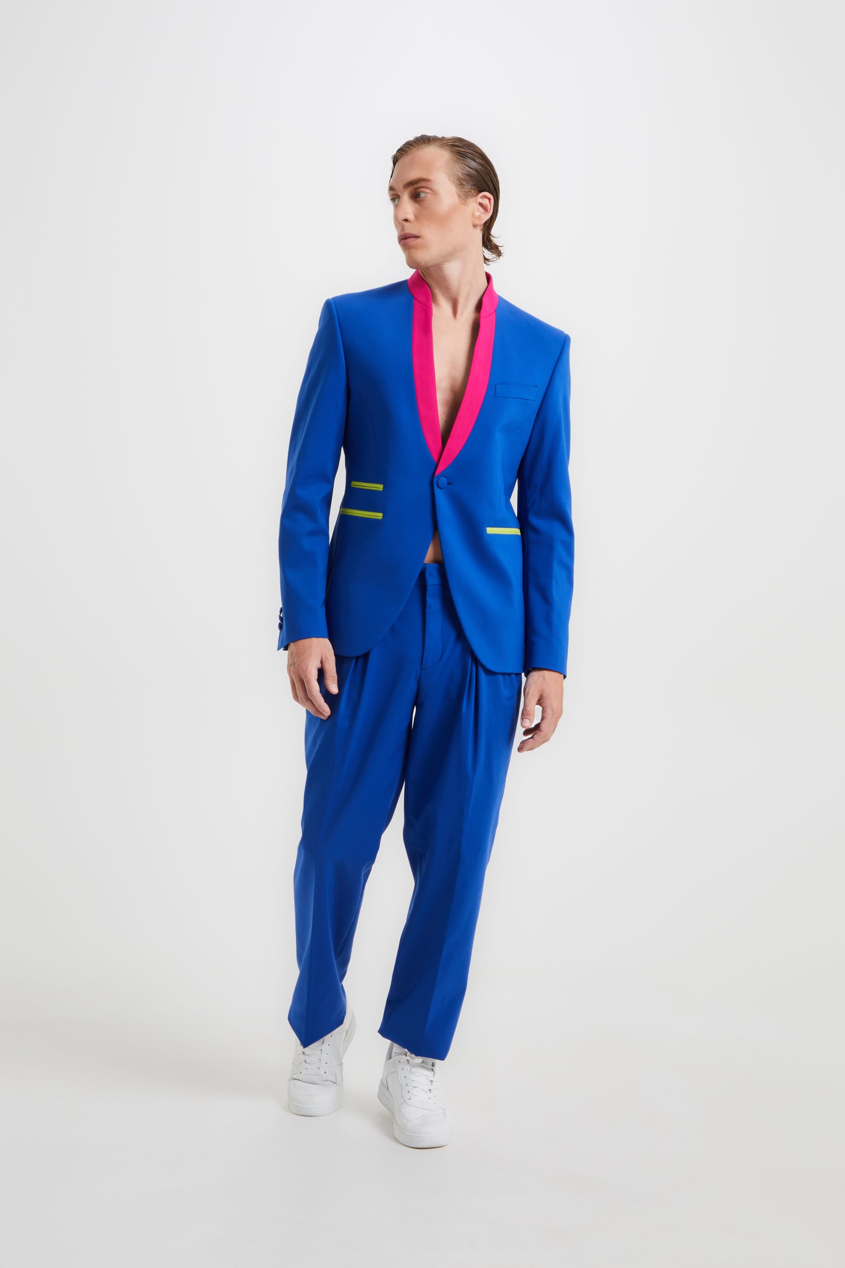 Blue suits with korean neckline blazer characterized by fuchsia collar inserts and contrasting lime pockets. The trousers have a soft and over fit thanks the folds it has.