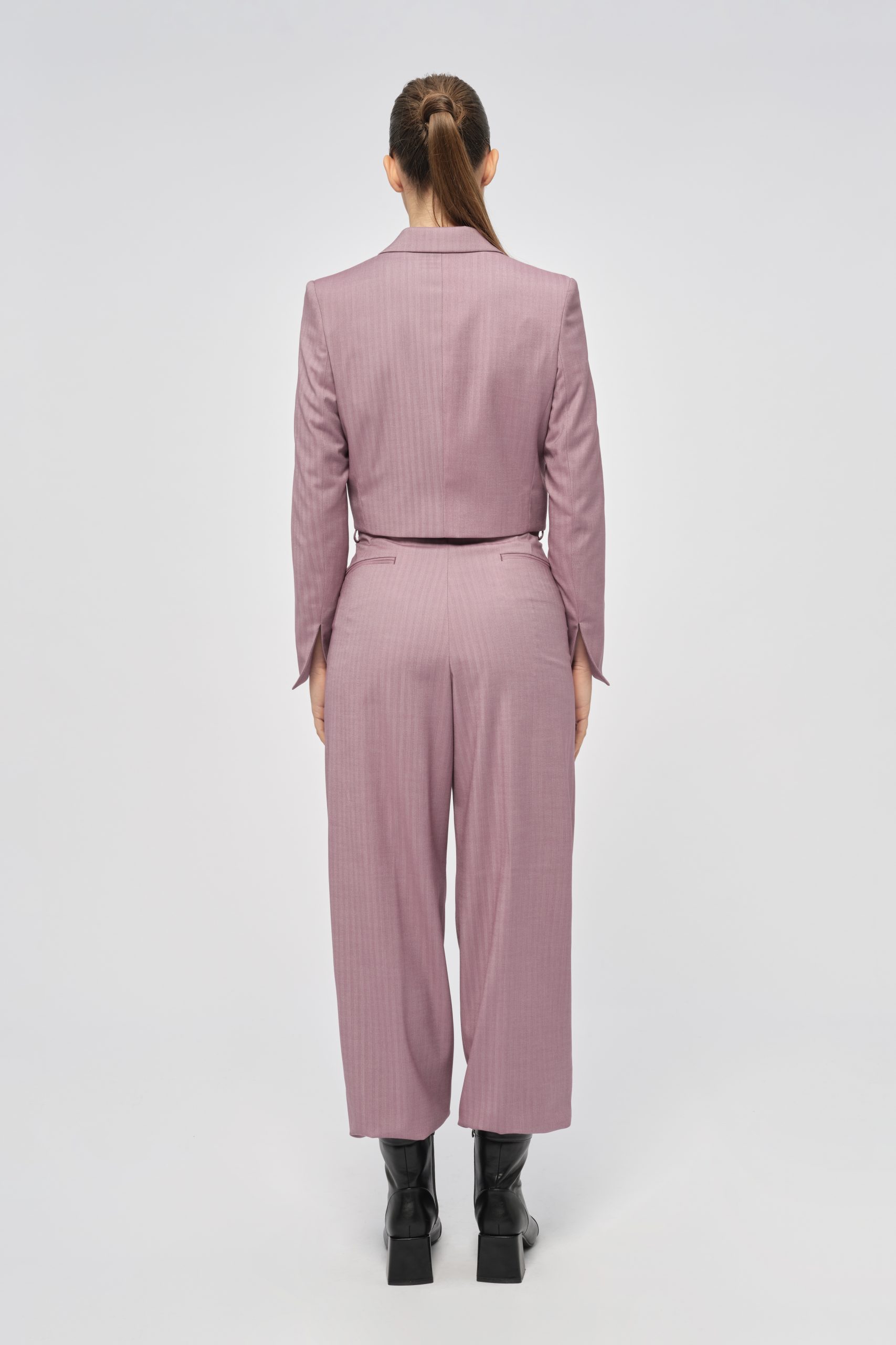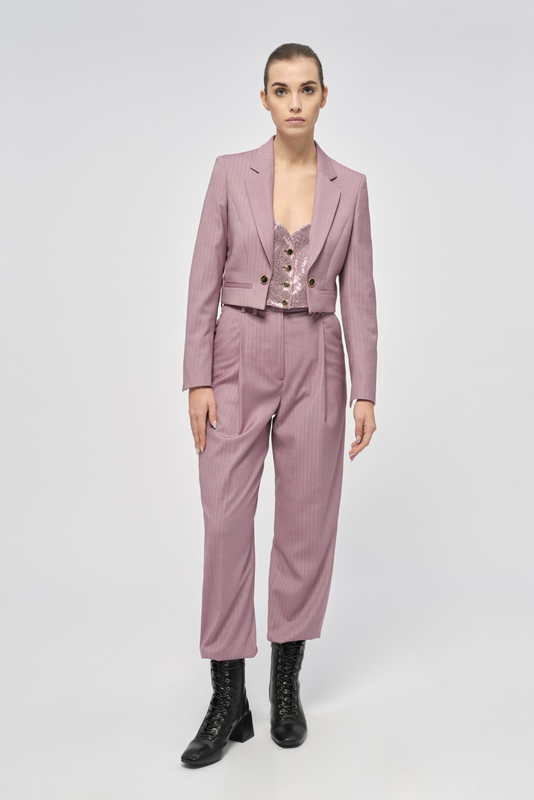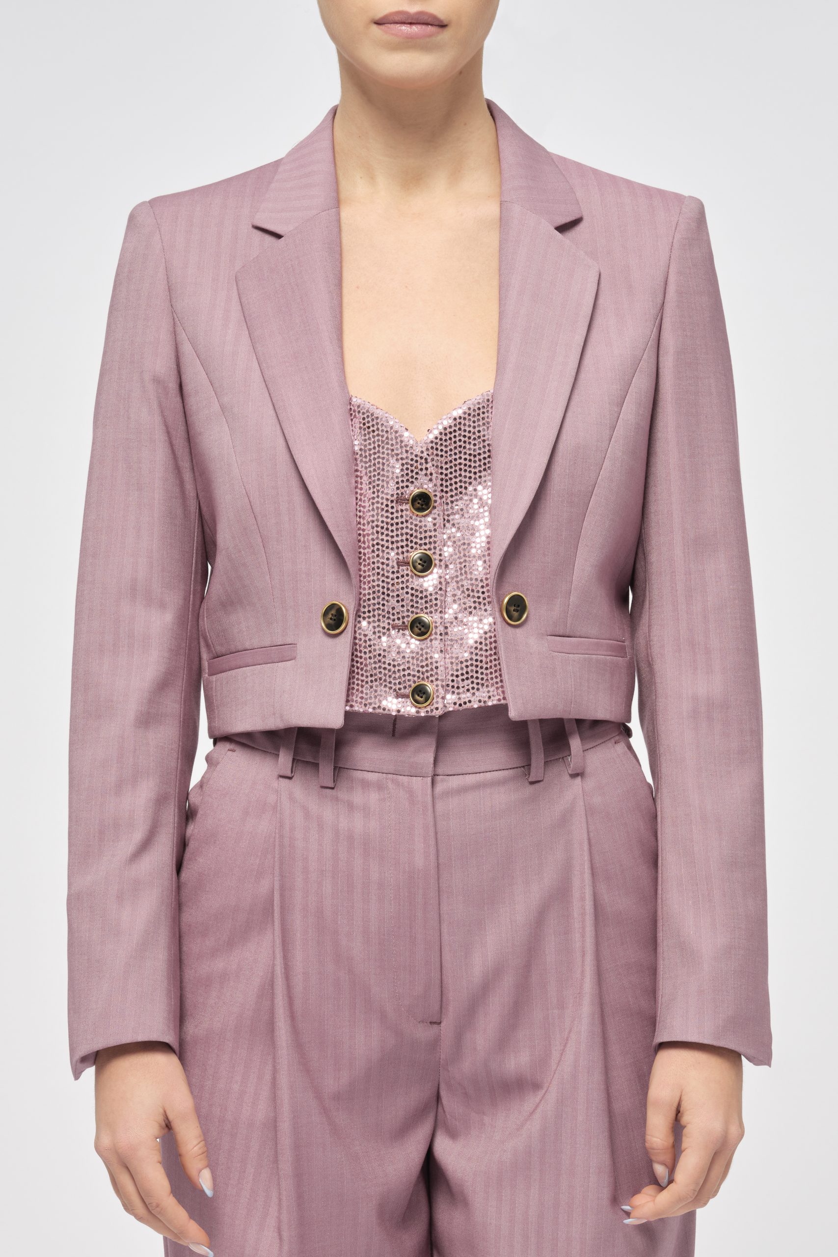 Elegant and dazzling crop blazer with paillets in the inserted waistcoat, to never go unnoticed. Paired with straight trousers
