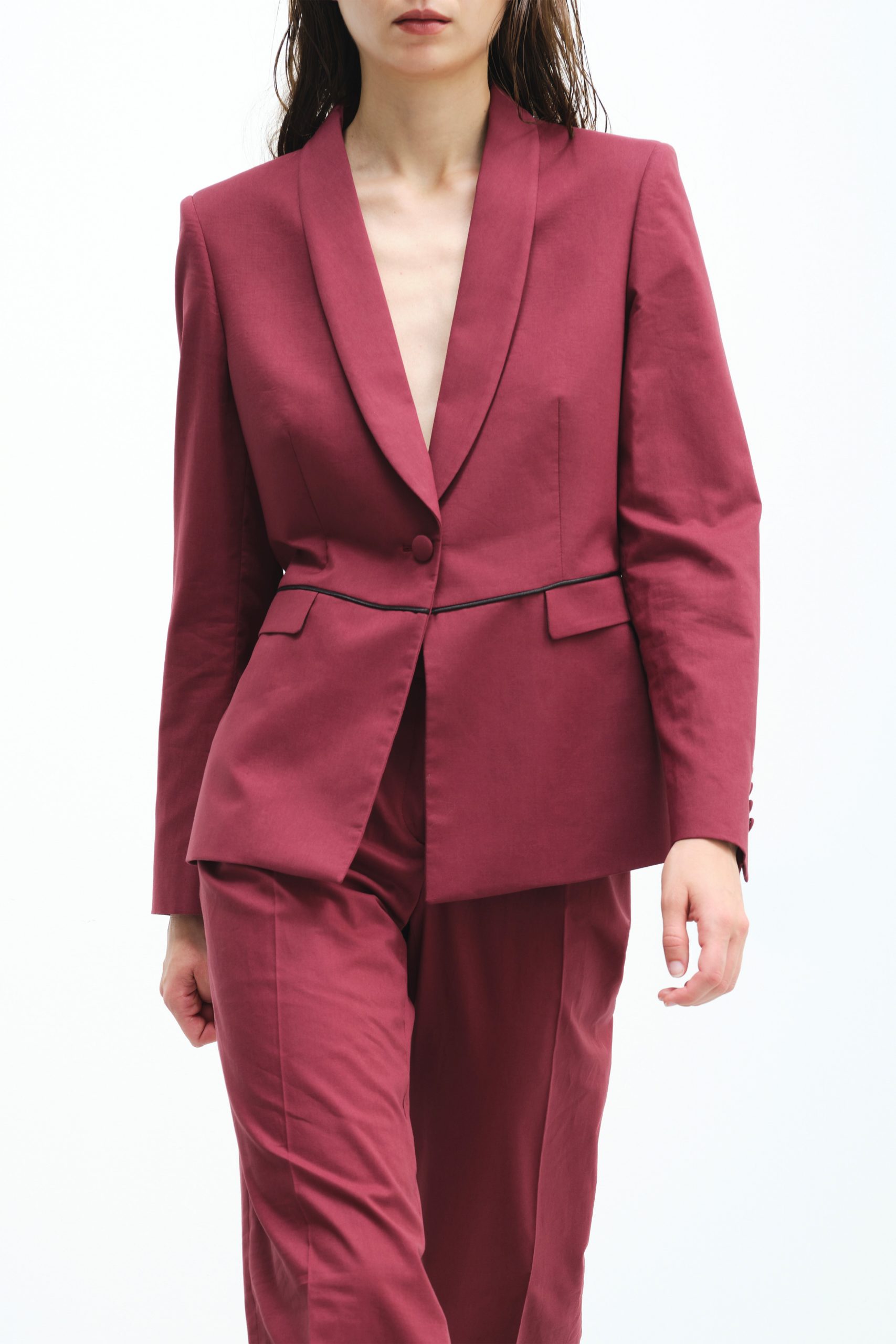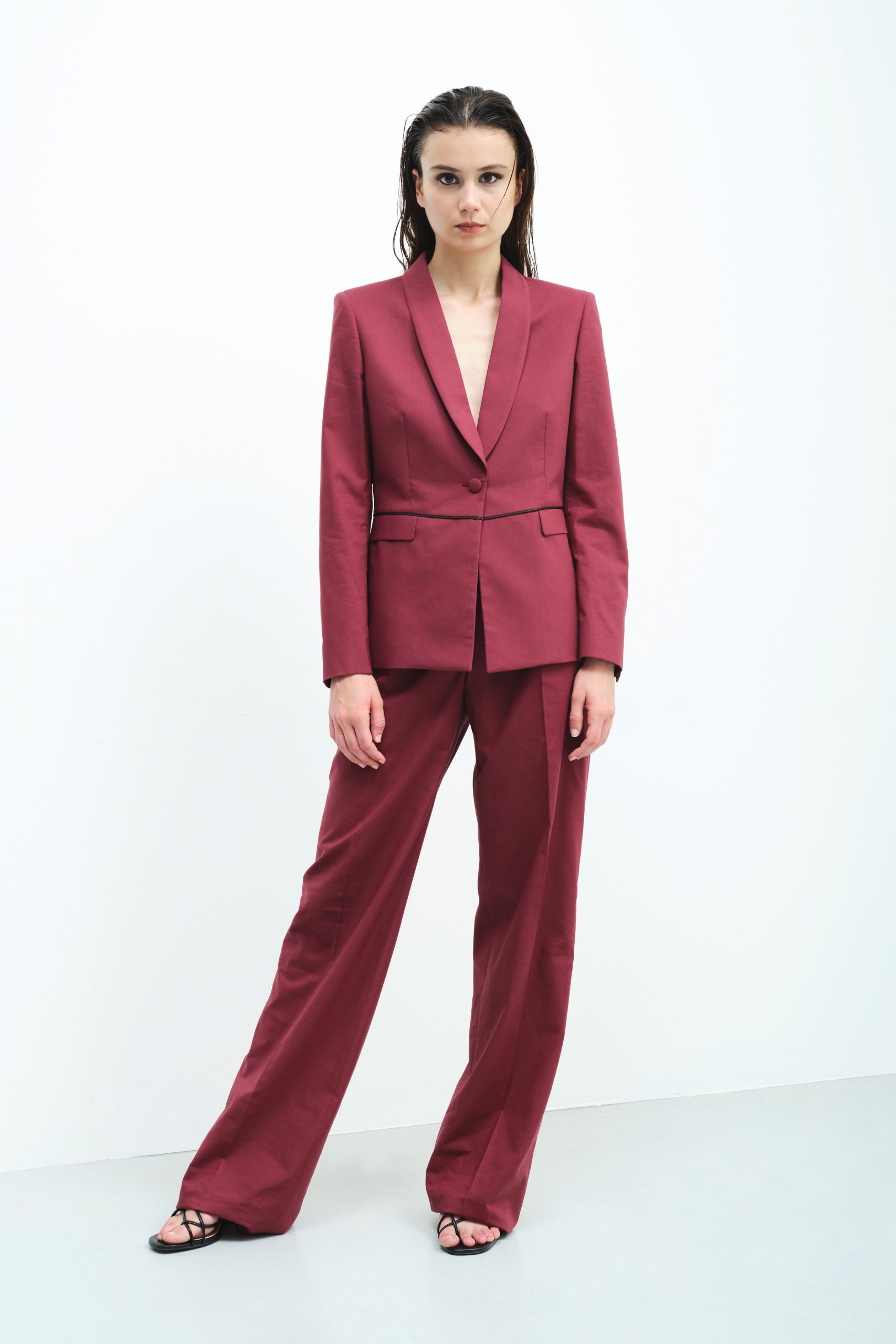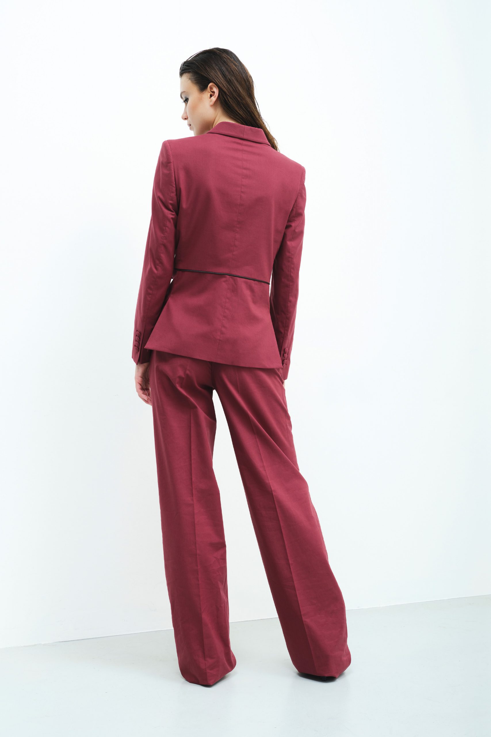 Minimal and elegant single-breasted blazer with inserted black satin piping at the waist and double slit at the back combined with palazzo trousers.